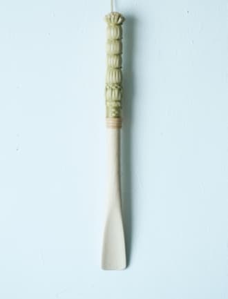 長野県松本市の民芸品、松本箒の端材を使ってつくった靴べら「hoki_hera(ホウキヘラ)」。工房の目の前に原料であるホウキモロコシの畑があり、工房の業務の7割は畑仕事。材料から製品まで一括してつくる体制に感銘を受けたそう。