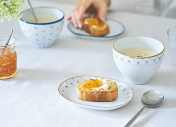 有田焼の窯元と一緒に生み出した「mg&gk(もぐとごく)」では日常の使用シーンを想定した器をデザイン。有田焼特有の青い顔料、呉須(ごす)の涼やかな柄に金のアクセントが効いています。プロダクトのみならず、ブランディングやグラフィックデザインも担当。