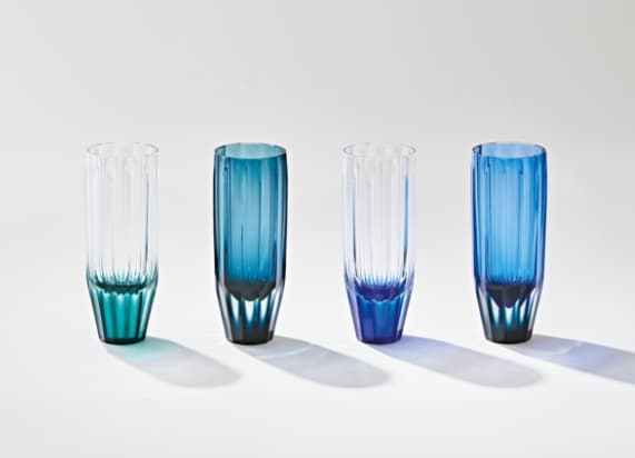 薩摩切子の工房とのコラボブランド「grad. (グラッド)」から「grad. ice(グラッド アイス)」。異なる色のガラスを何層も重ねてカットする薩摩切子の技法をアピールすべく生まれたデザイン。豊かなグラデーション、現代の食卓に合わせやすいすっきりとモダンな形が魅力。