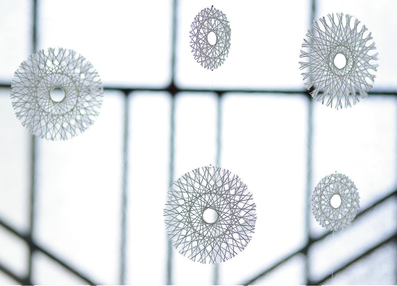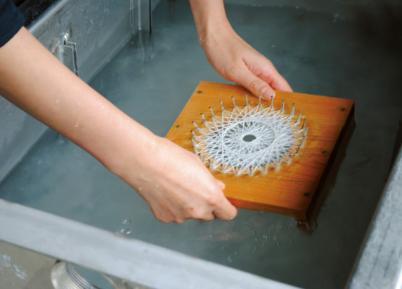 「呼吸する和紙」初の商品、「呼吸する和紙のモビール」。和紙をもっと今のインテリアになじむものにしたいとデザインされたものです。木の枠に均等に打った釘に規則的に糸をかけて幾何学柄を描き、