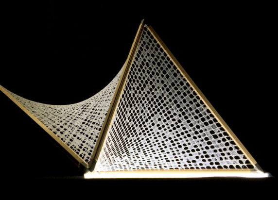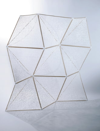 グリッド状に張り巡らせた糸にポツポツとまとわりつく和紙。意思を持つようにうねる台形のフレーム。この不思議な形の衝立の作者、佐藤友佳理さんは、元モデルというユニークな経歴の持ち主です。