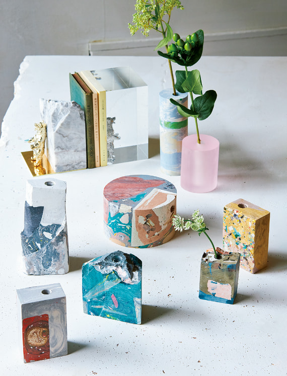 異なる種類の作品同士や、他のインテリアとも一緒に飾ってほしいとの思いから、さまざまな作品をつくる外山さん。写真手前の穴が開いた5点と奥の背が高い円柱は大理石を模した「MINE ORE」シリーズ。色とりどりの水溶性樹脂を型に流し込んで固め、切り出して形をつくります。中央の円柱は、大理石や植物などの天然素材と樹脂を組み合わせた新作オブジェ。左奥はアンティークの熊のパーツを元につくった鋳造品と、大理石やアクリルを組み合わせたブックエンド。右奥のピンクの一輪挿しは試作品で、今冬に予定している展示会に向けて目下制作中とのこと。