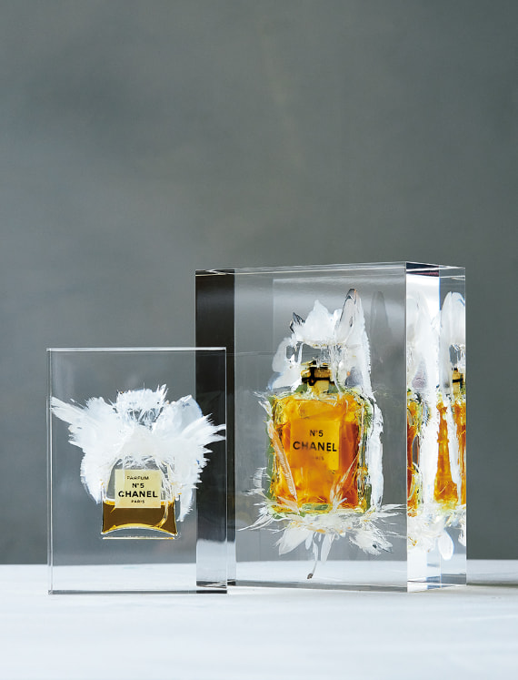 骨董市などで手に入れたという古いシャネルの香水瓶を、アクリルの中に閉じ込めたオブジェ。アクリルが固まる際の圧力で瓶が割れ、染み出した香水のアルコール成分が反応してアクリル内部に爆発したようなヒビをつくっています。「ヒビは予期していなかった偶然の産物ですが、面白い効果を生んでくれました」と外山さん。アクリルのサイズは元の香水の箱にそろえているそう。本家のパッケージと並べて飾っても素敵です。