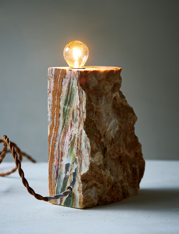 オニキスの原石をそのまま用いて照明に仕立てた「Stone light」。美しい層を持つゴツゴツとした岩と、そこからニョキッと突き出た電球やコードとのコントラストが楽しい。部屋の床や棚に置いたり、外山さんの他の作品とともにコーディネートしたくなる一品です。
