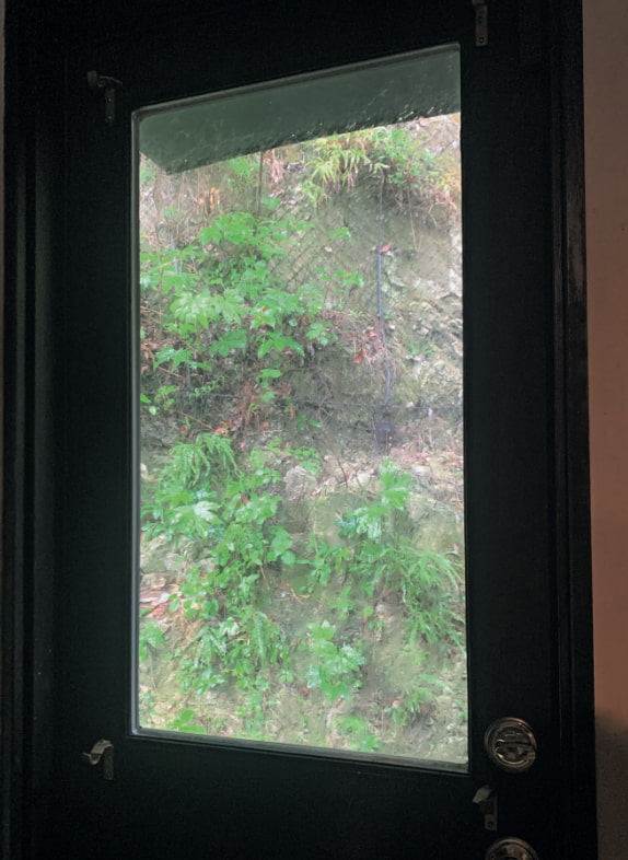 自宅の窓からの雨の日の景色。雨粒に濡れていつもより濃いグリーンに染まった木々の様子もまた美しい。
