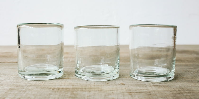 約4㎜の厚みが手に優しく馴染む、奥原硝子製造所の「筒型コップ」。手仕事ゆえの不ぞろいなサイズもご愛嬌です。各1,430円(税込み)/日々の暮らし