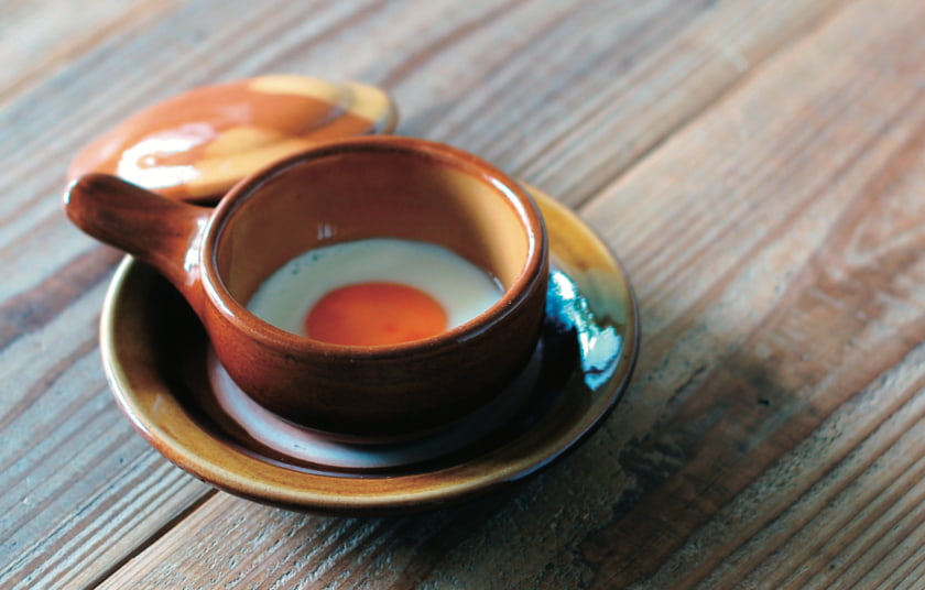 そんな卵を調理するのにふさわしい、かわいい民藝品が島根県にあります。その名もエッグベーカー。卵を割り入れて直火にかけ数分、半熟になったらそのまま食卓に出せる便利な器。卵のように丸みのあるフォルムが親しみやすく、この地域に伝わる布志名焼のガレナ釉の黄色も食欲をそそります。
