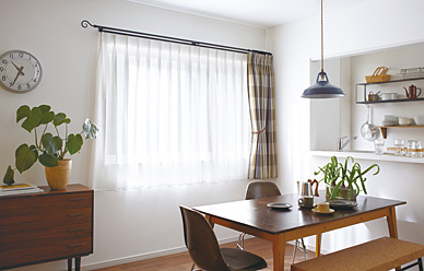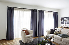 ![]() 通常のリングランナー式の場合、1窓ごとにカーテンを束ねるため、中央にカーテンがたまり、重い空間に…。ブラケットスルー機構にすれば、カーテンレールを1本にして両側のみにカーテンをまとめることができるので、スッキリして明るいリビングを演出できます。 |
