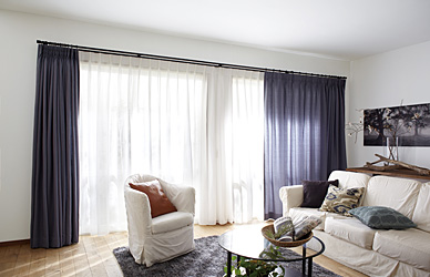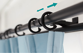 ![]() 通常のリングランナー式では、カーテンが両開きにしかできないため、窓の近くに家具などがあるとごちゃついて見えます。 ブラケットスルー機構なら、カーテンを片寄せにできるため、窓周りがスッキリします。 |