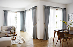 ![]() 通常のリングランナー式では、各コーナーにカーテンがたまってしまい、もたついた感じに見えてしまいます。ブラケットスルー機構により、カーテンを片寄せにすると、コーナーのカーテンのたまりが少なくなって、窓からの出入りや家具の配置など、自由度がアップします。 |