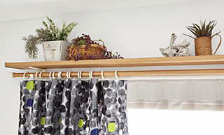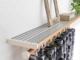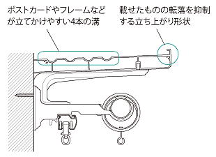 ①ディスプレイシェルフ(棚板) デッドスペースであったカーテンレールの上をインテリアスペースとして活用することが出来ます。 棚板にはブラケットピッチ間で5㎏(例:文庫本30冊程度)までのものを載せることが出来ます。 ②立てかけに便利な溝・落下抑制形状< |