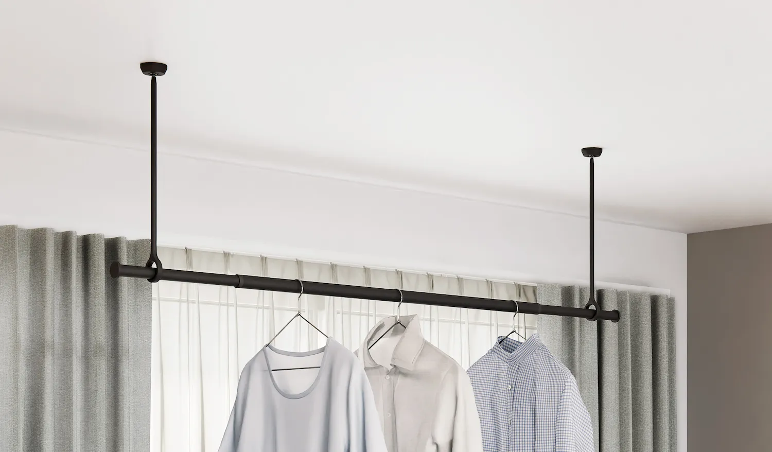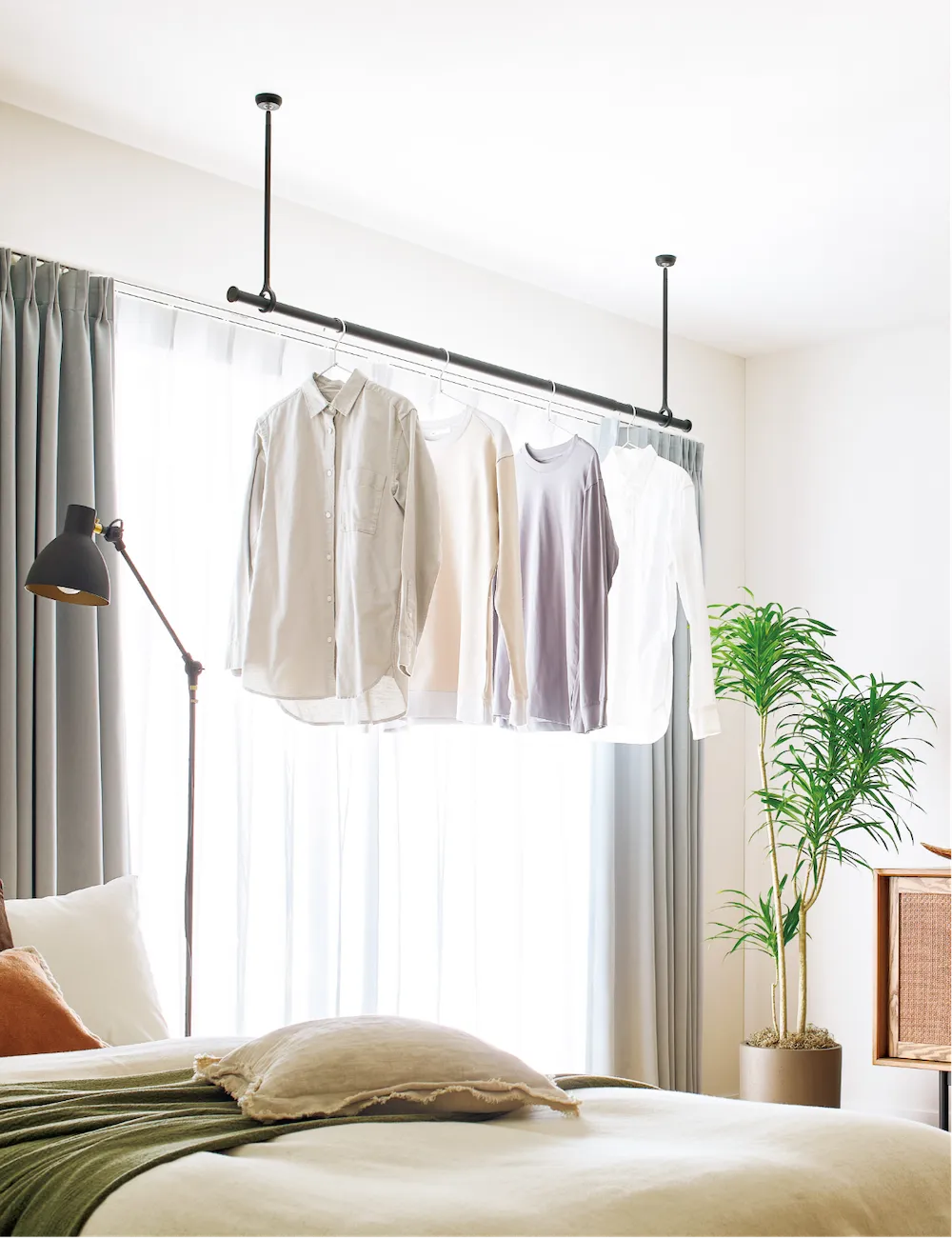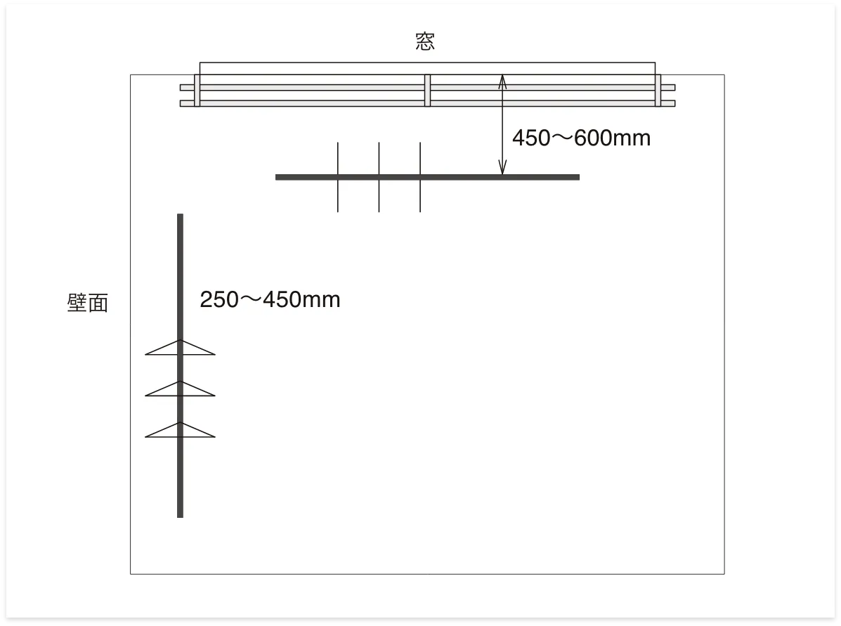 窓から450~600mmほど離して設置すると、ハンガーに掛けた服がカーテンに干渉しません。