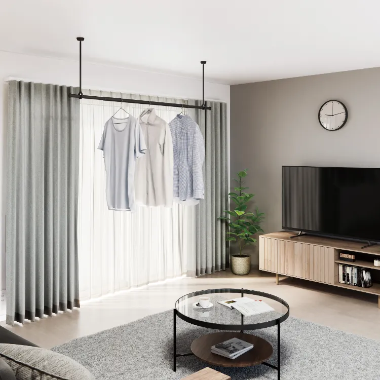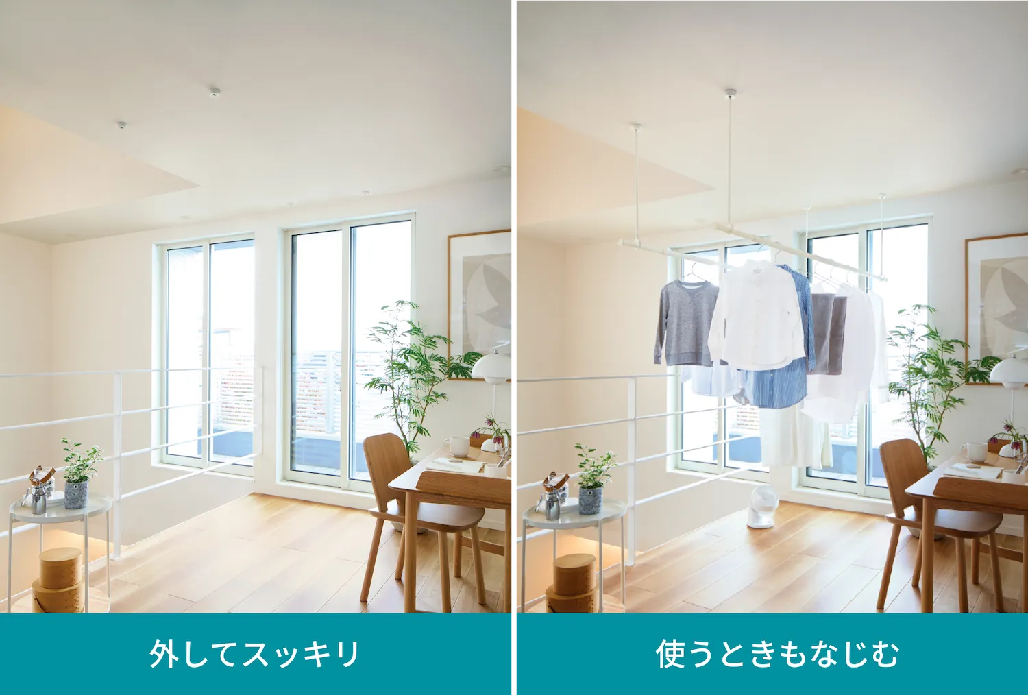 使わないときは、吊りポールを片手でさっと取り外せます。 天井に取り付けたブラケットに差し込むだけのシンプルな構造で、施工も簡単。
