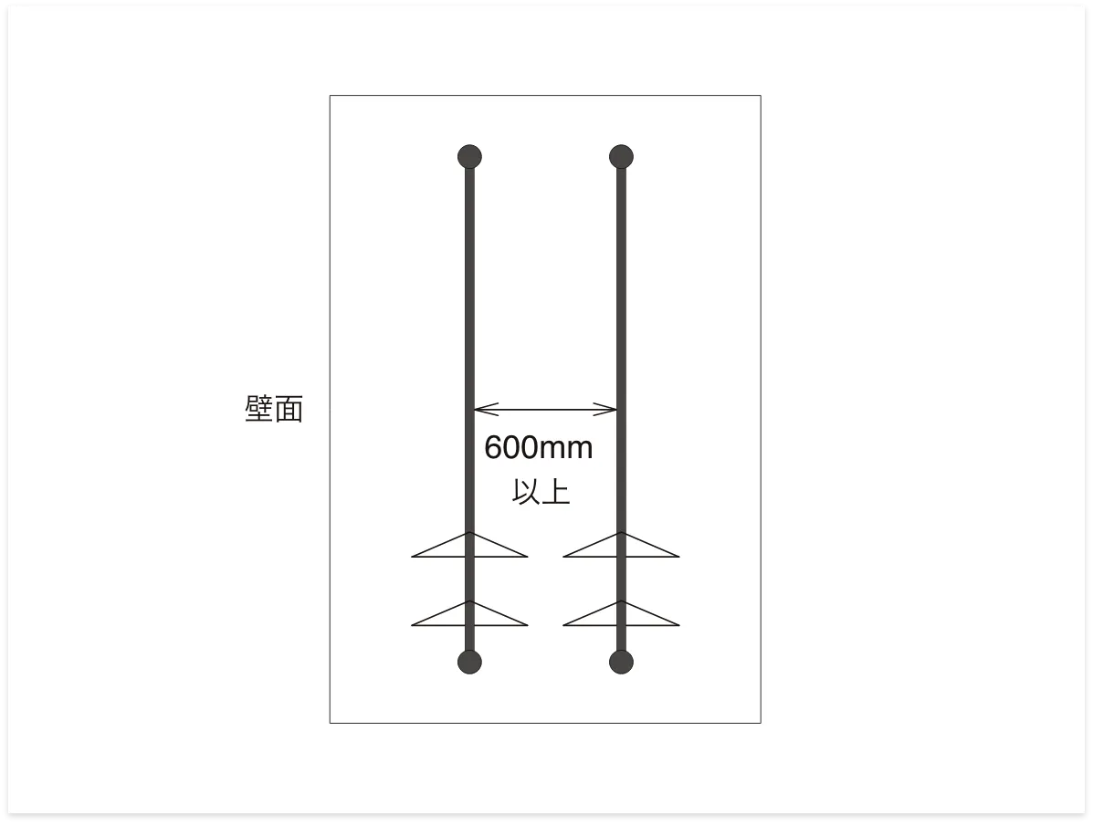 ハンガーに掛けた服同士がぶつからないように、2本のランドリーバーの間は600mm以上離して設置することをおすすめします。