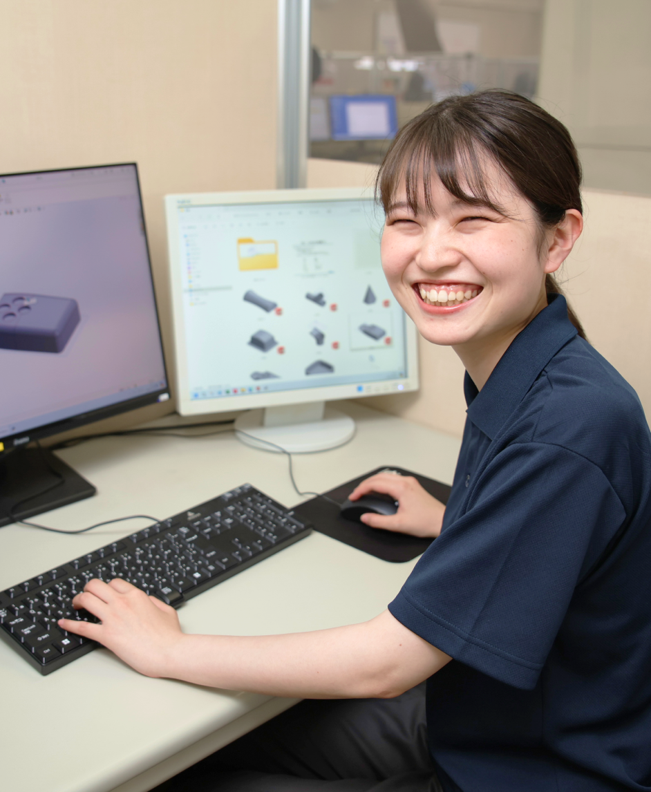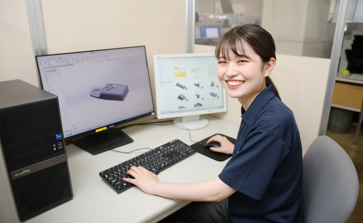 当社の商品設計職は、ただ図面を書くだけの仕事ではありません。 新製品のテーマ企画を受けて構想設計を行い、自身が設計したものを試作品として形にし、 それらが問題なく使用できるものなのか、検証及び評価まで担当します。 若手のうちから一つの製品を担当することができ、新製品開発に幅広く関われるため、 プレッシャーはありますが、自身が設計した製品が世の中に出た時の喜びはひとしおです。また、製品の一部分ではなく、 完成品の設計に携わることができるのも当社の商品設計職の特徴です。