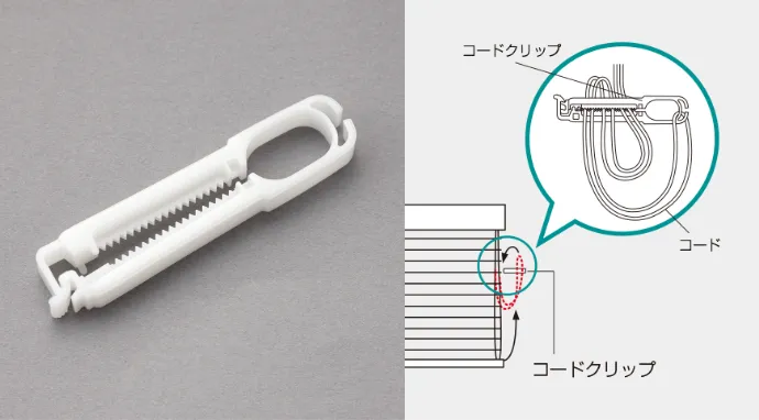 ブラインドを上げた時に、子供の手の届かない位置にコードを掛けておく部品です。